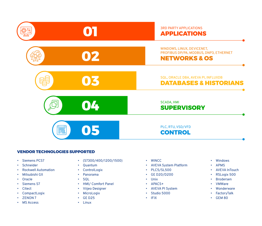 Our engineering teams have a wealth of experience in supporting a multitude of cross platform systems across the layers of automation, from databases, historians and SaaS applications; through to networks, DCS, PLC, SCADA, Telemetry and Drives.